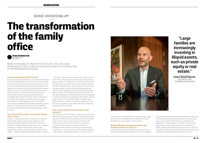 In 2021 LAFO has opened up to a more diversified audience by turning to the professions of private wealth management. This major development enables our association to contribute to the promotion of Luxembourg as a financial center at the international level as well as supporting and promoting the excellence of its private wealth players. We would like to thank the speakers who shared their insights in the wide array of topics linked to the family office activity. This year also marked my entitlement as Chairman of LAFO. My action will obviously stand in the continuation of Serge Krancenblum. In 2022, my priority goes to strengthening and revitalizing our network to help our members to face challenges, particularly in terms of digitalization, responsible investment and continuing education. I invite you to join our LinkedIn page! This second edition of our magazine includes insights from multi and single family officers, lawyers, private bankers, PE practitioner, service providers showcasing Luxembourg’s expertise with a focus on next generation of Family Offices and technology.